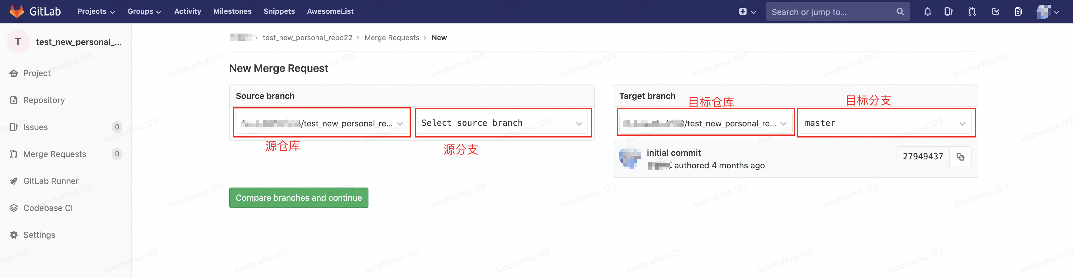 1. 给自己没有权限的项目的repo提交合并请求